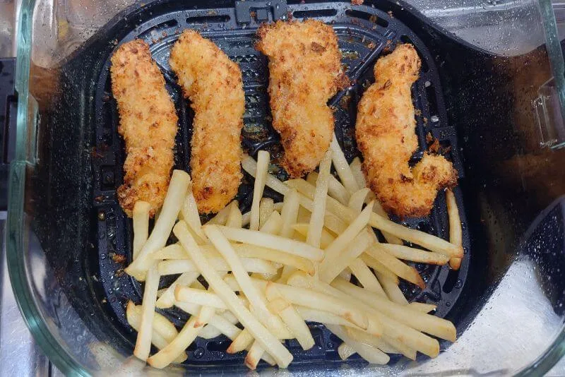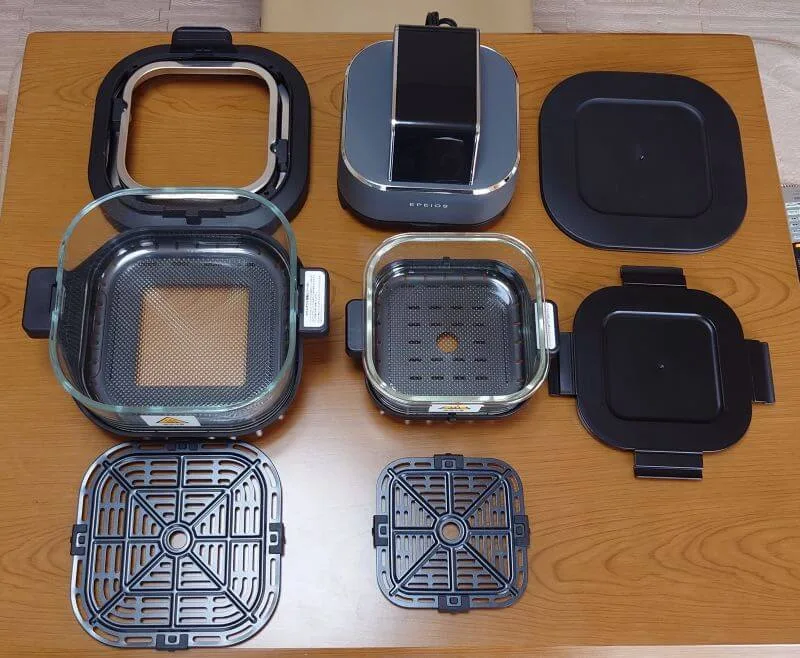 | 素材 | ガラス製のため、油汚れが落ちやすく、ニオイ移りや色移りの心配がほとんどありません | フッ素加工された金属製バスケットと網(クリスパープレート)が一般的です。 汚れは落ちやすいですが、ガラスに比べるとニオイ残りやコーティング剥がれの心配がわずかにあります |