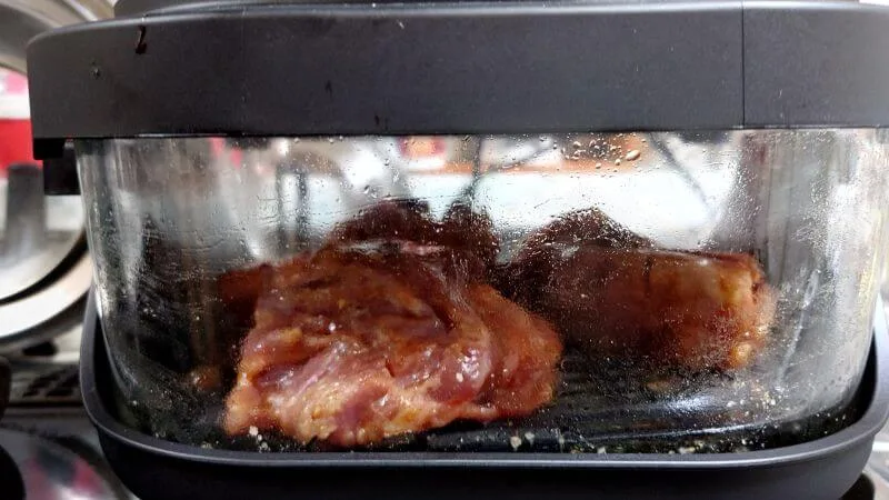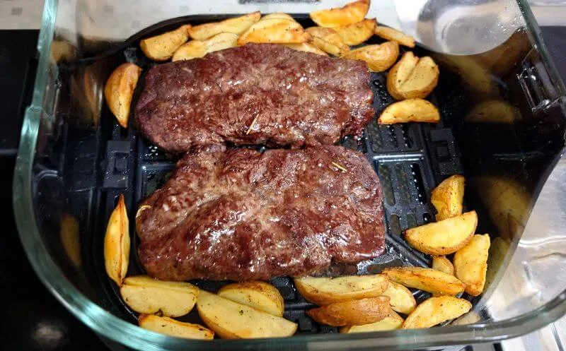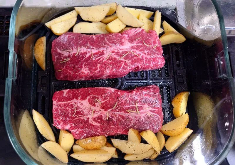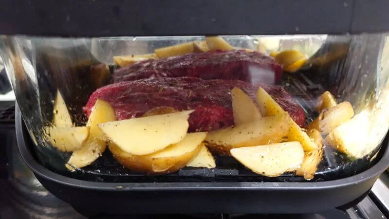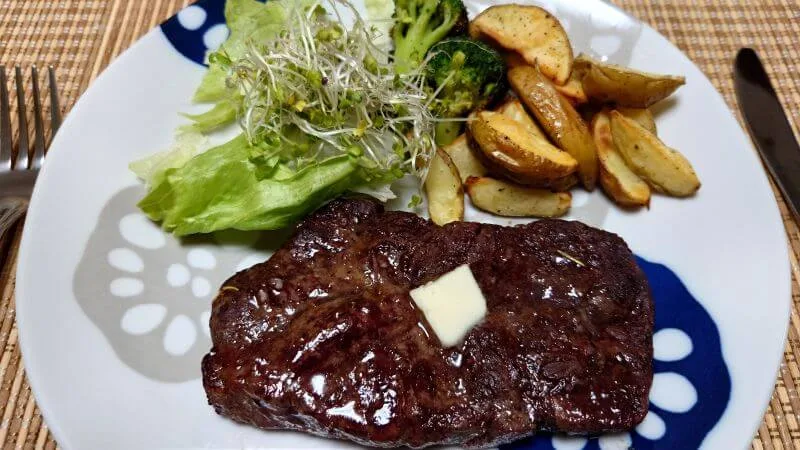 ミスジステーキ2枚をジャガイモと一緒に「高温調理モード」で調理しました。