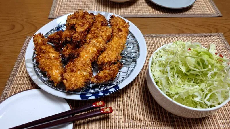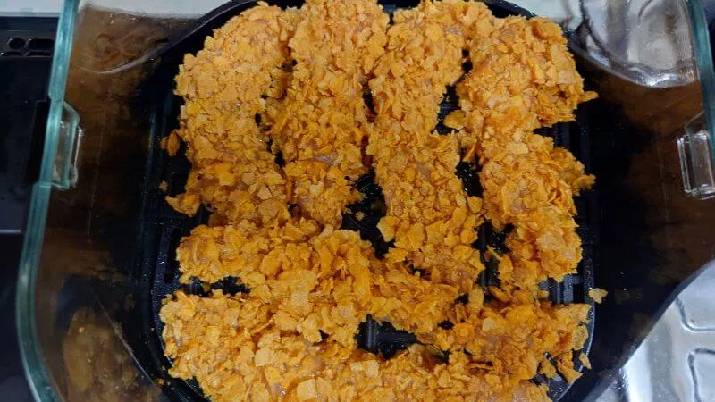 パン粉の代りに軽く砕いた味のないコーンフレークをササミに衣付けして「ノンフライモード」で調理しました。