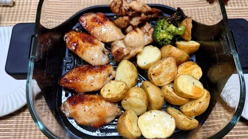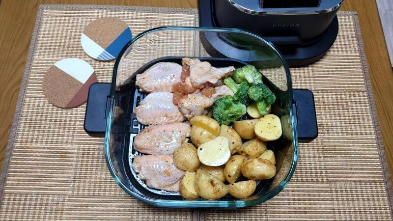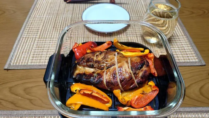 食材の大きさや火の通りの違う4種類の食材を一緒に焼くので、調理中に焼き加減の確認が必要ですが、ガラスボウルなので状況が良く見えて助かりました。